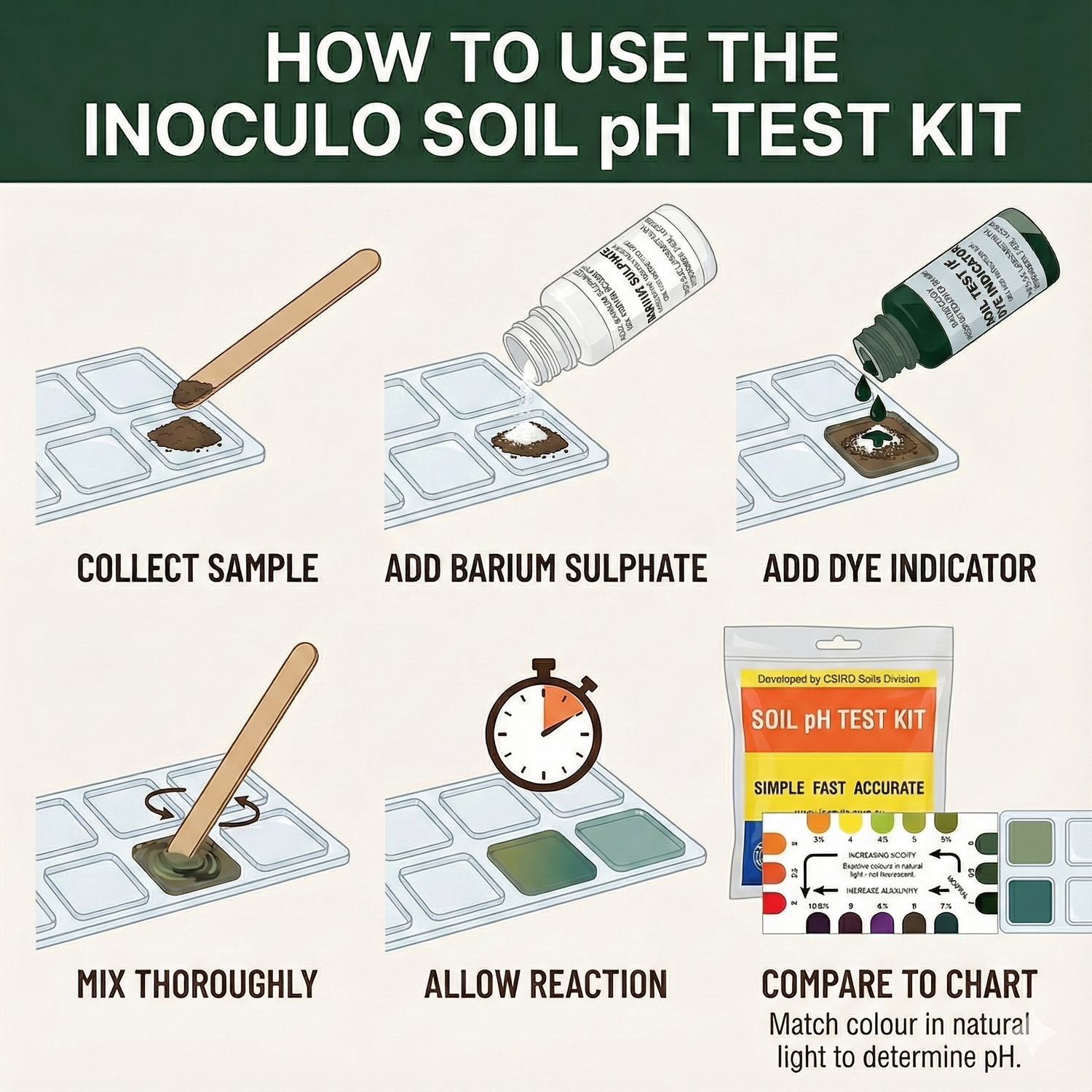 Follow the link for detailed instructions on how to use your Inoculo Soil PH Test kit